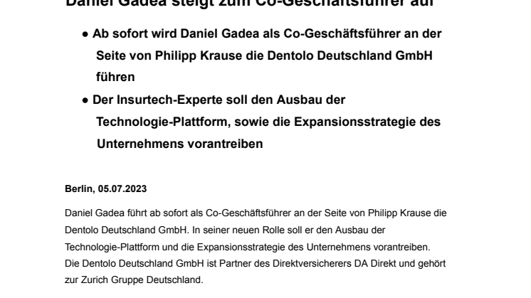Berlin, 05.07.2023: Daniel Gadea führt ab sofort als Co-Geschäftsführer an der Seite von Philipp Krause die Dentolo Deutschland GmbH. In seiner neuen Rolle soll er den Ausbau der Technologie-Plattform und die Expansionsstrategie des Unternehmens vorantreiben. Die Dentolo Deutschland GmbH ist Partner des Direktversicherers DA Direkt und gehört zur Zurich Gruppe Deutschland.