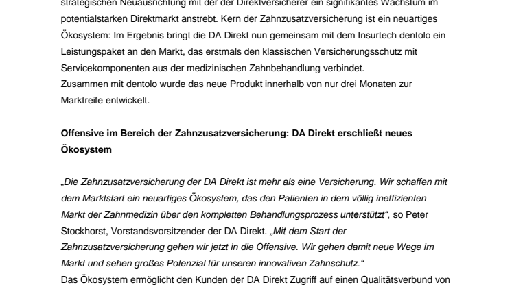 „Die Zahnzusatzversicherung der DA Direkt ist mehr als eine Versicherung. Wir schaffen mit dem Marktstart ein neuartiges Ökosystem, das den Patienten in dem völlig ineffizienten Markt der Zahnmedizin über den kompletten Behandlungsprozess unterstützt“, so Peter Stockhorst, Vorstandsvorsitzender der DA Direkt. „Mit dem Start der Zahnzusatzversicherung gehen wir jetzt in die Offensive. Wir gehen damit neue Wege im Markt und sehen großes Potenzial für unseren innovativen Zahnschutz.“